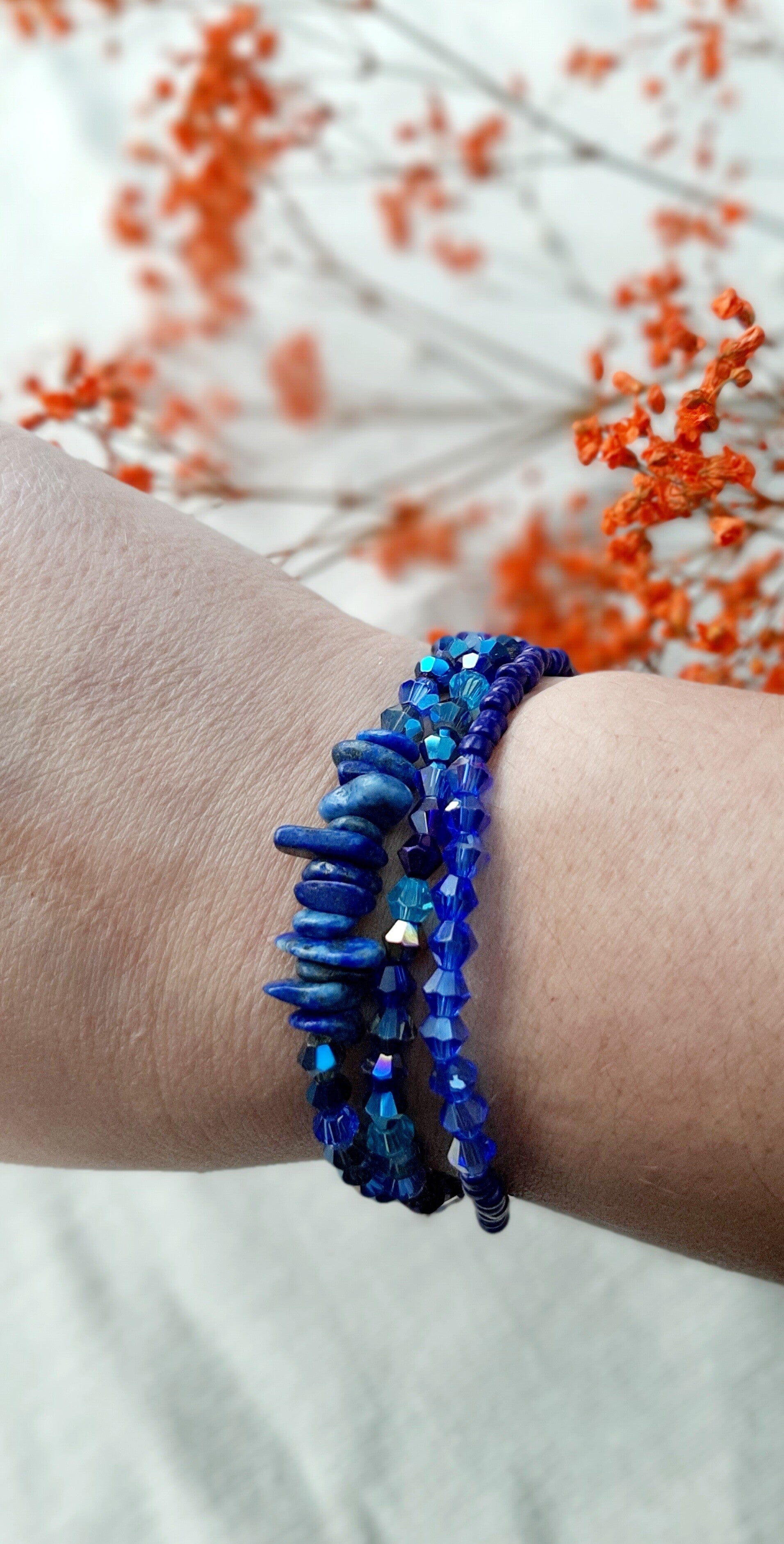 toffe combinatie van 3 fijne elastiche armbandjes met Lazulli natuurstenen en facetkralen in de tinten (hoog)blauw/paars
