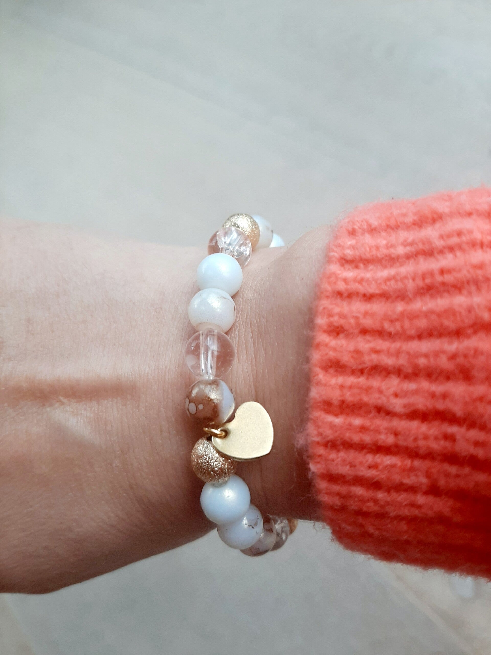 armbandje met wit/beige en gouden tinten afgewerkt met een hangertje in een hart