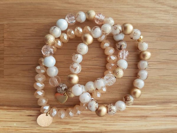 3 armbandjes in gouden en beige tinten afgewerkt met 2 bedels